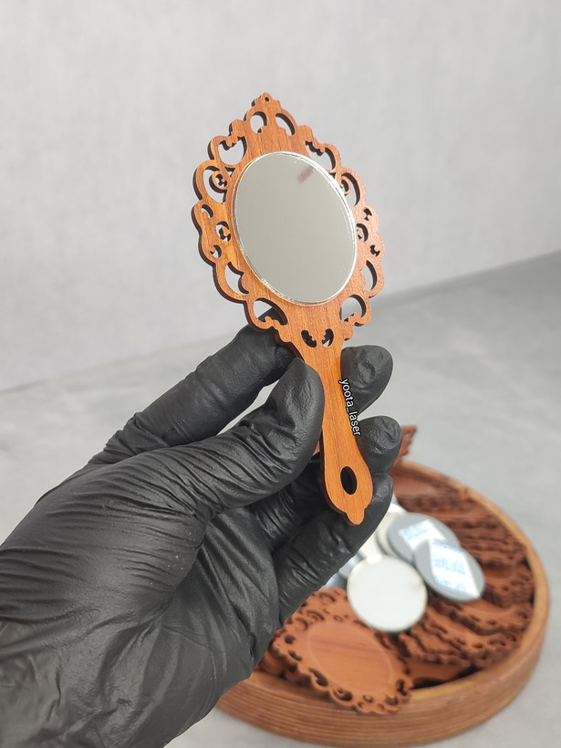 گیفت آینه دستی سایز حدود 13 تا ۱۴ سانتی دسته چوبی mdf