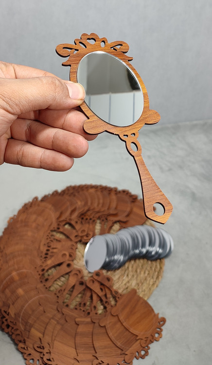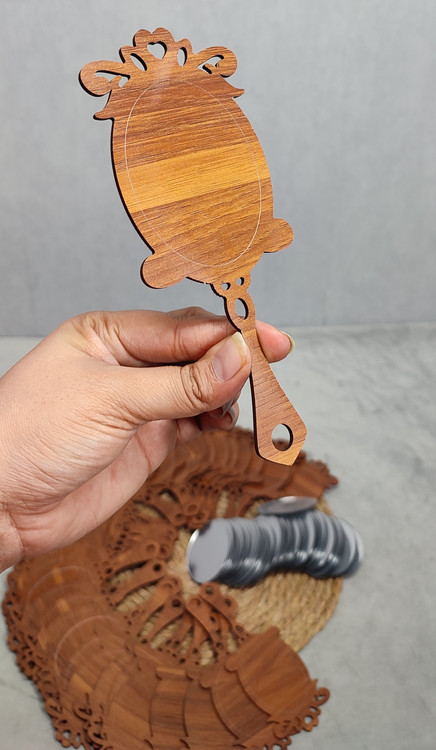 گیفت آینه دستی سایز حدود 13 تا ۱۴ سانتی دسته چوبی mdf