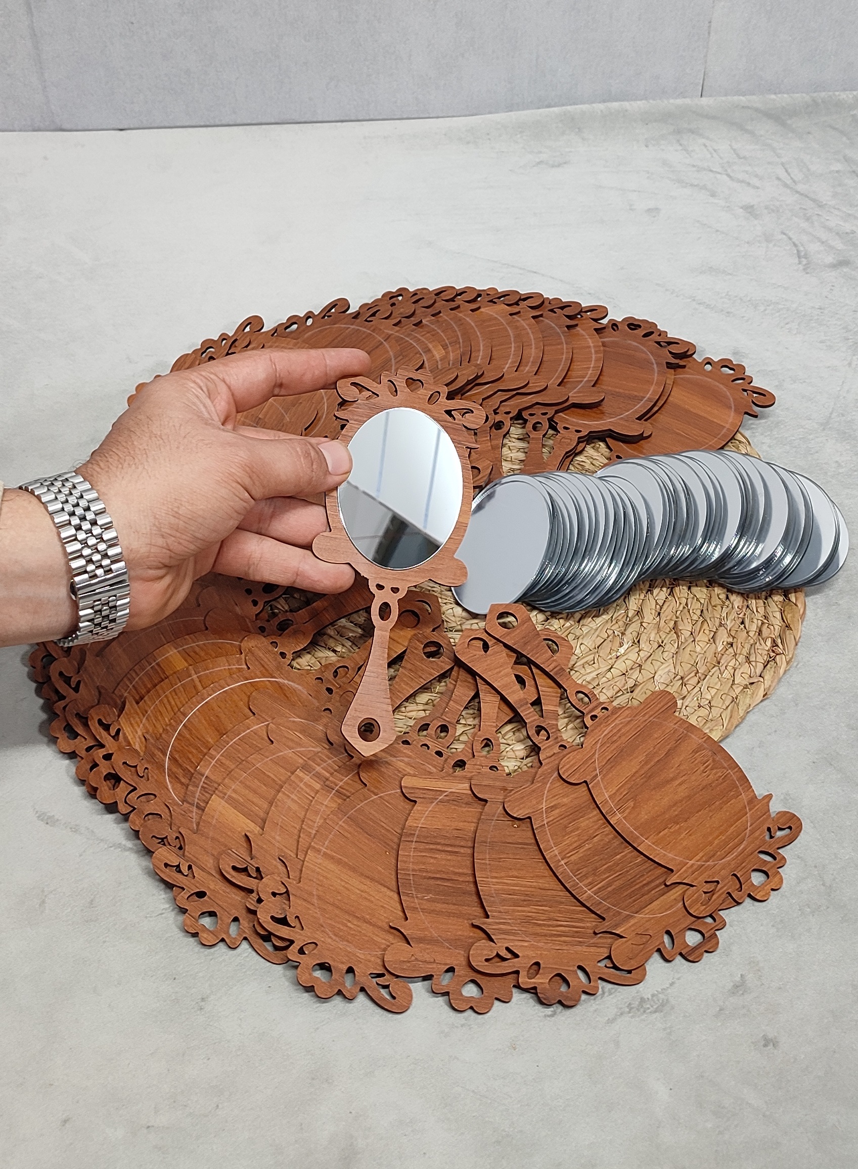 گیفت آینه دستی سایز حدود 13 تا ۱۴ سانتی دسته چوبی mdf