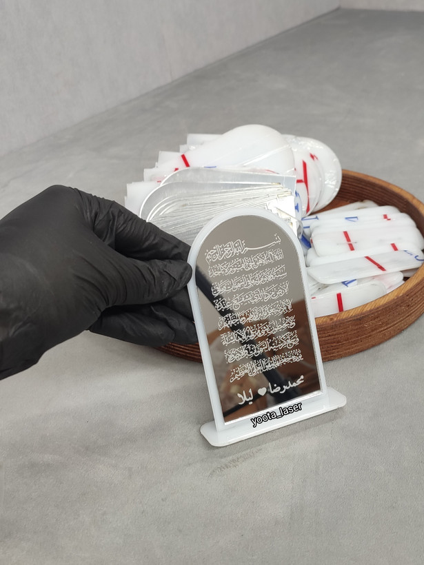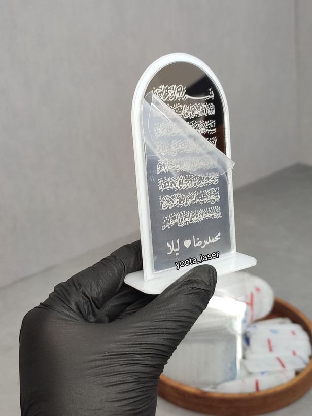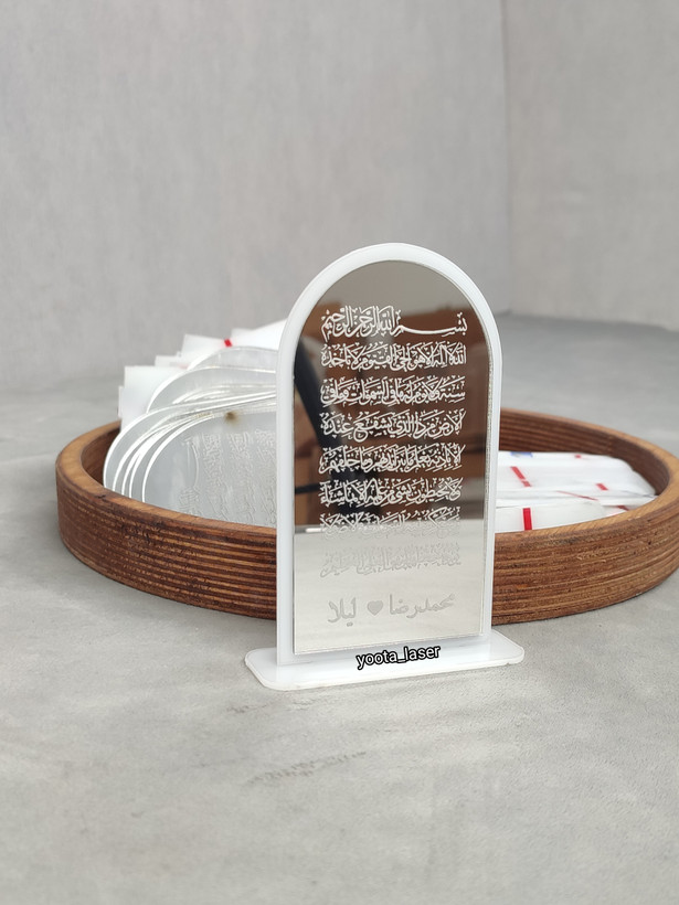 گیفت استندی مدل طاقی به همراه لوح آیت الکرسی از جنس آینه. مناسب گیفت و یادگاری انواع مراسم رسمی و عقد و عروسی و ...