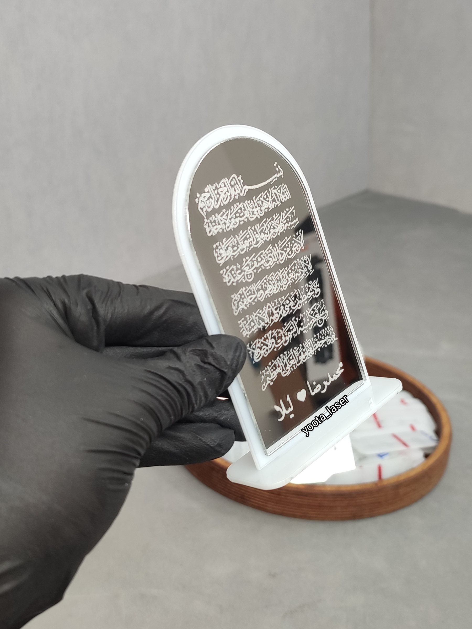 گیفت استندی مدل طاقی به همراه لوح آیت الکرسی از جنس آینه. مناسب گیفت و یادگاری انواع مراسم رسمی و عقد و عروسی و ...